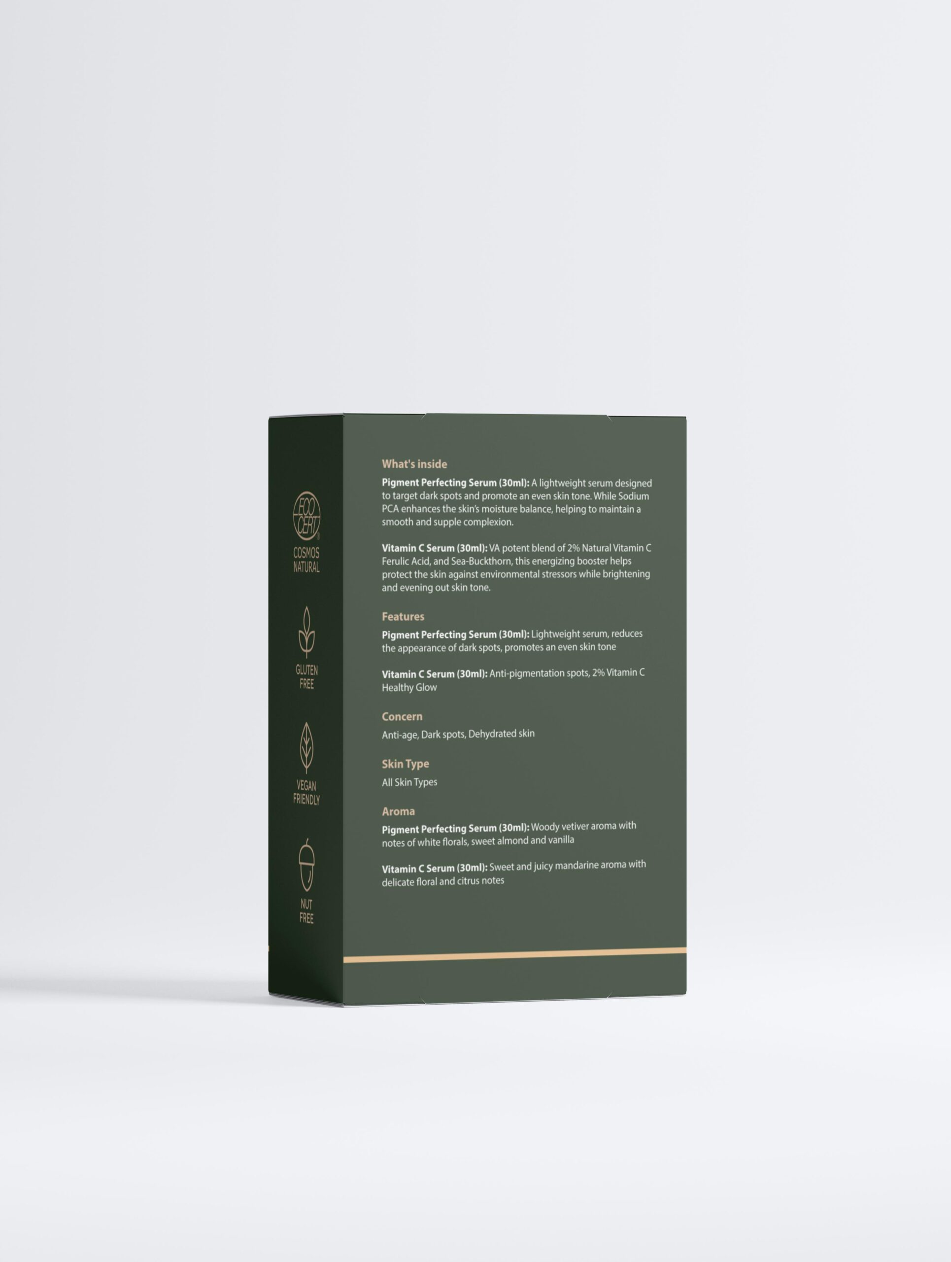 - Pigment Perfecting Serum (30 ml): A lightweight serum designed to target dark spots and promote an even skin tone. While Sodium PCA enhances the skin’s moisture balance, helping to maintain a smooth and supple complexion.